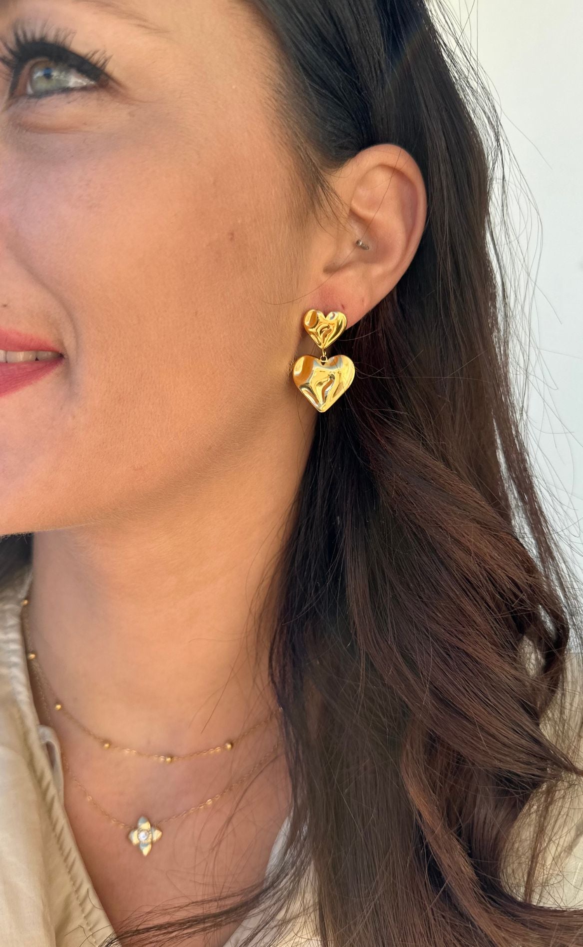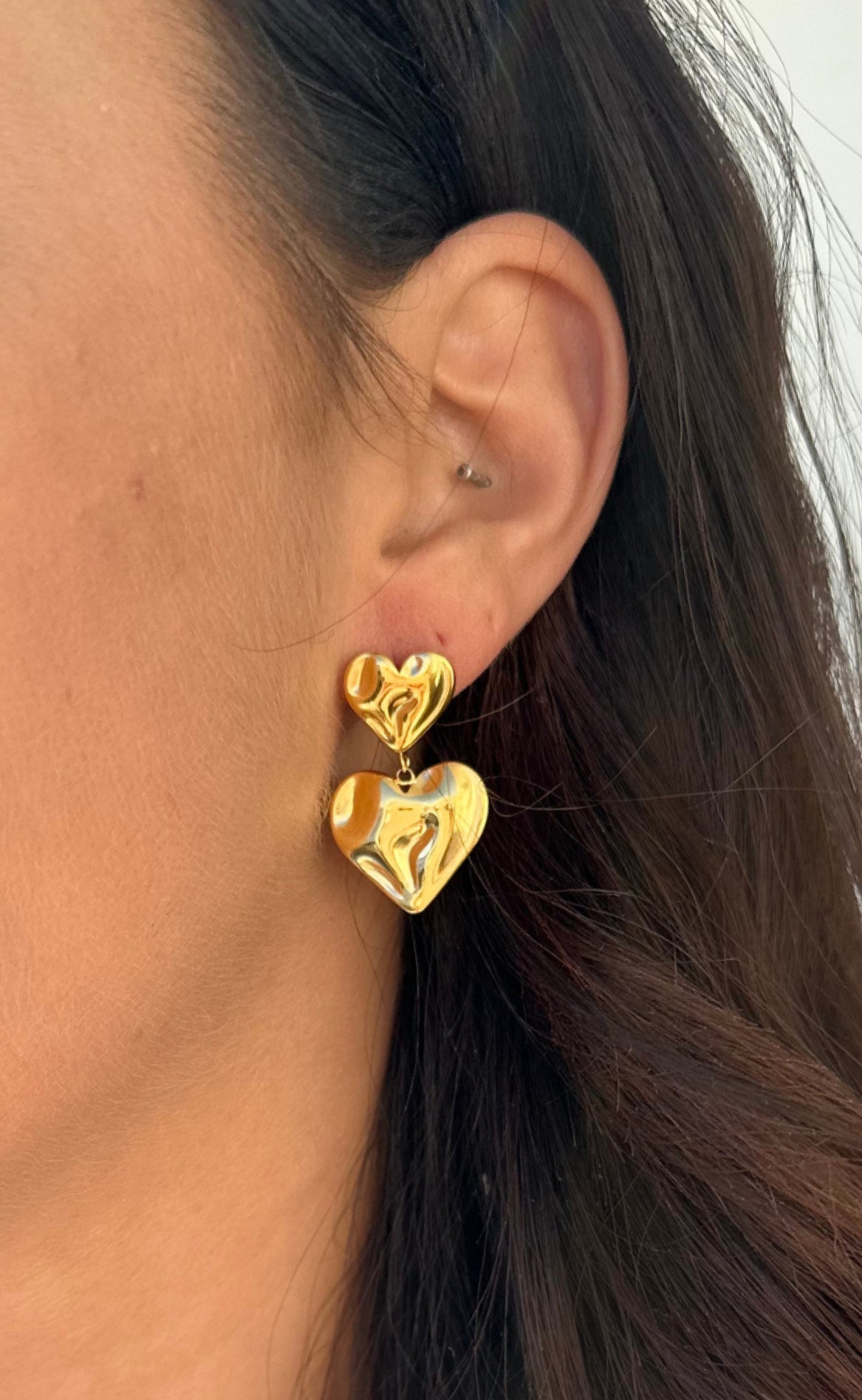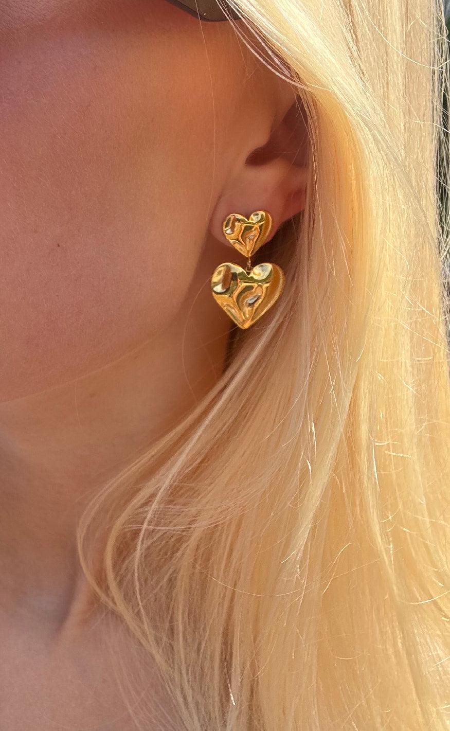 Vores bedst solgt øreringe fra Smykkeli Copenhagen: To hjerter i guld med en hamret overflade, som skaber et virkelig eksklusivt udtryk.